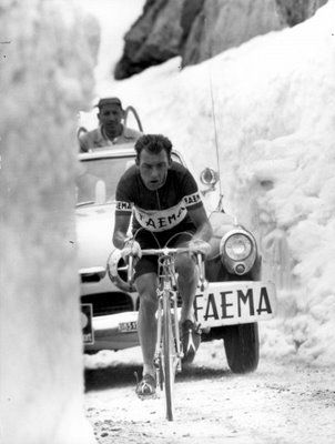 Quell’8 Giugno del 1956 al Giro d’Italia, in maglia Faema-Guerra, Charly Gaul si aggiudicò, nelle prime due settimane di gara, la nona e la quindicesima frazione; l’8 giugno vinse quindi anche la ventesima tappa, che andava da Merano al Monte Bondone attraversando anche i passi del Rolle e del Brocon, sterrato. In una giornata da tregenda, caratterizzata da neve, vento e gelo, Gaul tagliò per primo il traguardo arrivando però in uno stato di semicongelamento, tanto che, dopo essere stato tirato giù di peso dalla bicicletta, riuscì a proferir parola solo dopo essere stato immerso in una vasca d’acqua calda. Ben 44 degli 87 ciclisti partiti al mattino abbandonarono la corsa. Il secondo classificato di giornata, Alessandro Fantini, giunse con quasi 8 minuti di ritardo da Gaul; a dodici primi arrivò invece Fiorenzo Magni (il quale, avendo una spalla fratturata, reggeva il manubrio con un laccio stretto fra i denti) mentre la maglia rosa Pasquale Fornara si ritirò. Charly Gaul risalì così in un sol giorno dal quattordicesimo posto in classifica, che occupava alla partenza della tappa, al primo, e difese il primato nelle ultime due giornate di gara, fino all’arrivo di Milano. Proprio per onorare l’”eroica” tappa del Monte Bondone, nel 2006 fu istituita la granfondo “La Leggendaria Charly Gaul Trento – Monte Bondone“, ma questa è un’altra storia.