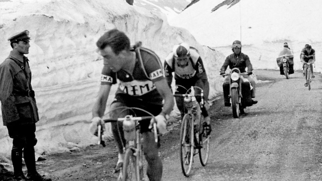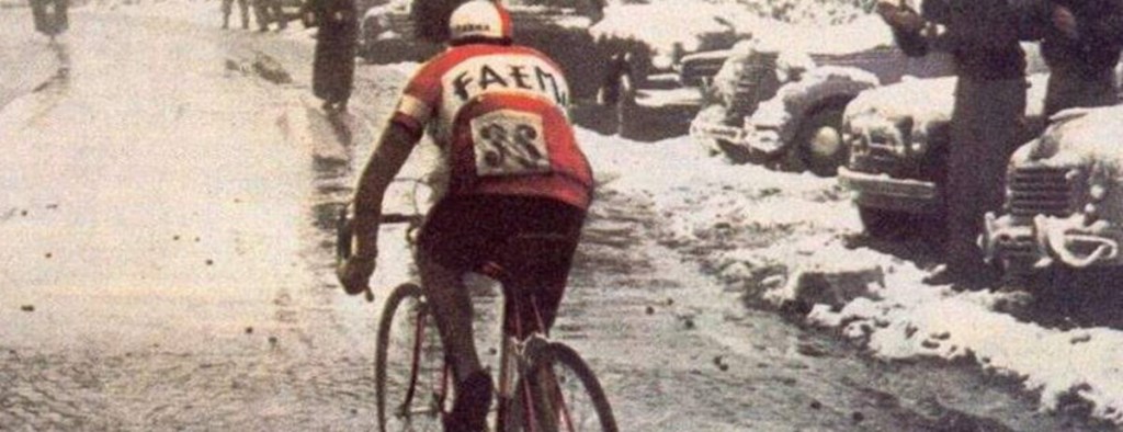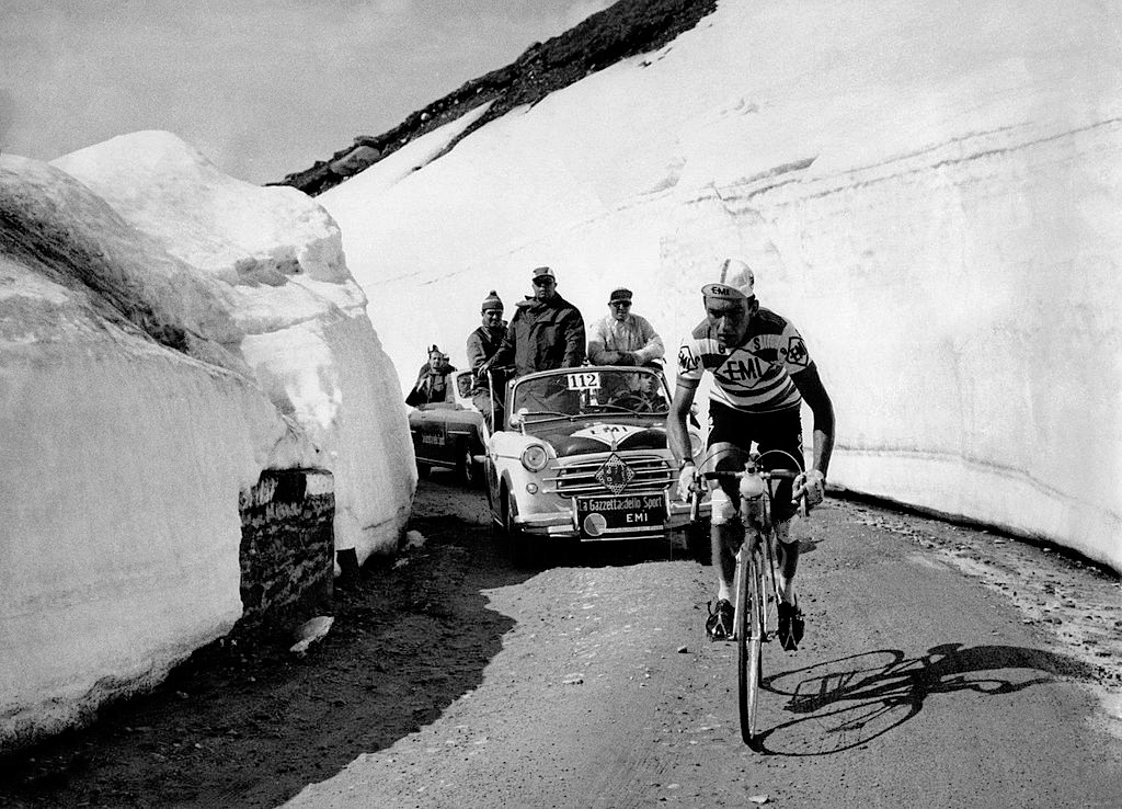 Quel 8 giugno del 1956 nella quindicesima tappa del Giro d’Italia Charly Gaul sbucava da due muri di neve come come un angelo apre le nuvole per mostrarsi, ma quel giorno tutto era, tranne che una giornata paradisiaca; una giornata da tregenda, caratterizzata da neve, vento e gelo, Gaul tagliò per primo il traguardo, arrivando però in uno stato di semicongelamento, tanto che, dopo essere stato tirato giù di peso dalla bicicletta, riuscì a proferir parola solo dopo essere stato immerso in una vasca d’acqua calda. Ben 44 degli 87 ciclisti partiti al mattino abbandonarono la corsa. Il secondo classificato di giornata, Alessandro Fantini, giunse con quasi 8 minuti di ritardo da Gaul; a dodici primi arrivò invece Fiorenzo Magni (il quale, avendo una spalla fratturata, reggeva il manubrio con un laccio stretto fra i denti), mentre la maglia rosa Pasquale Fornara si ritirò. Gaul risalì così in un sol giorno dal quattordicesimo posto in classifica, che occupava alla partenza della tappa, al primo e difese il primato nelle ultime due giornate di gara, fino all’arrivo di Milano.